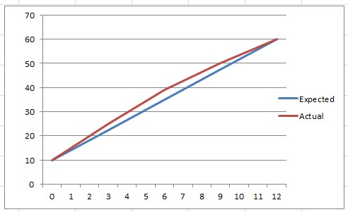 How about: Percentage = (ActualValue - 10) * 2 ?