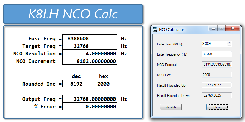I'm building a project that requires calculating numerous frequencies with the Numerically Controlled Oscillator (NCO) function in Fixed Duty Cycle Mode. Realizing that it would take me way too much time punching numbers into a calculator, I developed a simple app that does all the math work for me. I'm relatively new to the whole PC programming thing (Visual Studio 2015), but it works. Unzip the attached file, double click the .exe, and viola. If you right-click the .exe and select "Create shortcut", then drag the shortcut to your desktop (or selected folder), it will open from there. You must open/install it first, though.