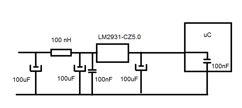 I used LM2931-CZ5 for power supply, 100 nF ceramic capacitors, even a 100 uH coil before the voltage regulator. The part of code which reads the values of ADC is the same in this code...