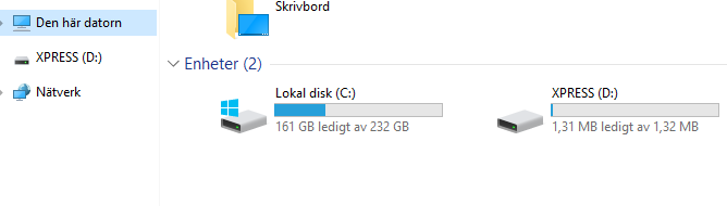 But the cool thing is that when you plug this new board in to the PC it not only shows up as a serial port, it also shows up as a mass storage device. Here you can see it showing up as D: with a label XPRESS on my system (I appologize for the Swedish screenshot but you get the idea).