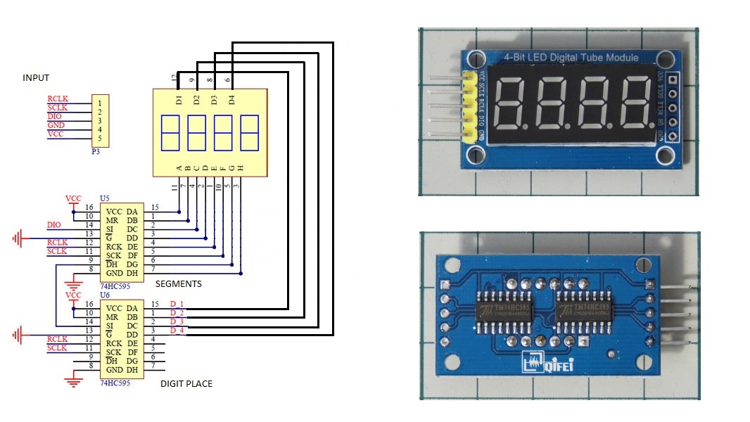 I start to play with one of this cheap 4 digit 7 segment display. The display is driven by two 74HC595 which one is for segments and the other is for common cathodes (digits).
