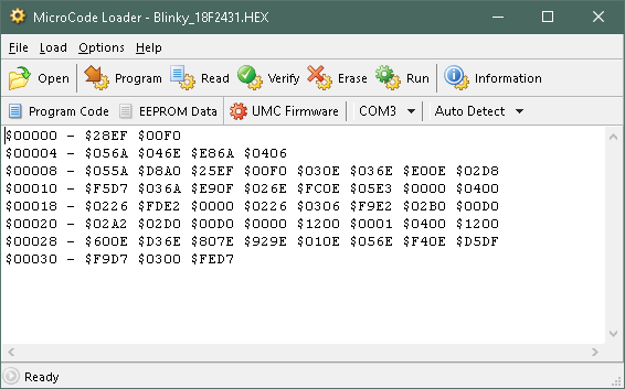 3.- I launched the Loader from within MCSP and loaded my "Blinky_18F2431.hex" file previously compiled: