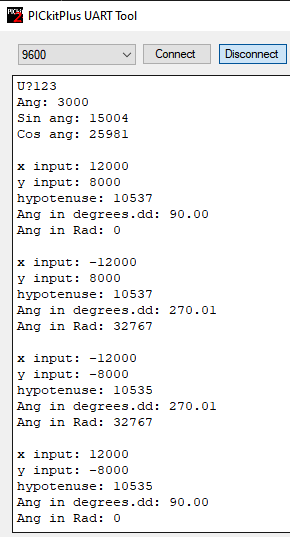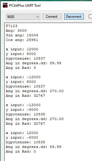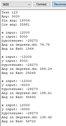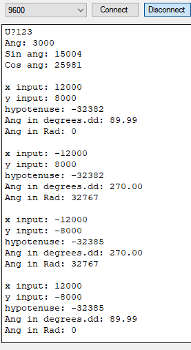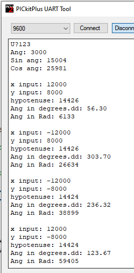 Also, I like the idea of transitioning from previous 28 pin PICs to the 18F26K83 due to numerous virtues it has; however one thing I discovered attempting to implement it for this particular application is that the 18F26K83 and the Cordic routines don't see eye-to-eye and produce erroneous results. Well, for some reason the results (particularly for atan2) always appear to exceed the maximum.