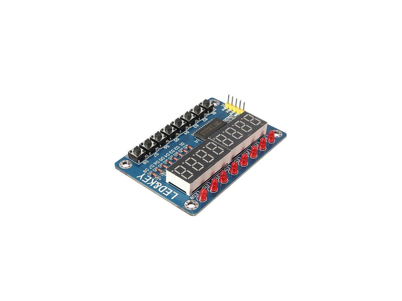 ' features 8 7-segment display characters, 8 discrete LEDs, and 8 pushbutton switches, and the TM1638 controller. This