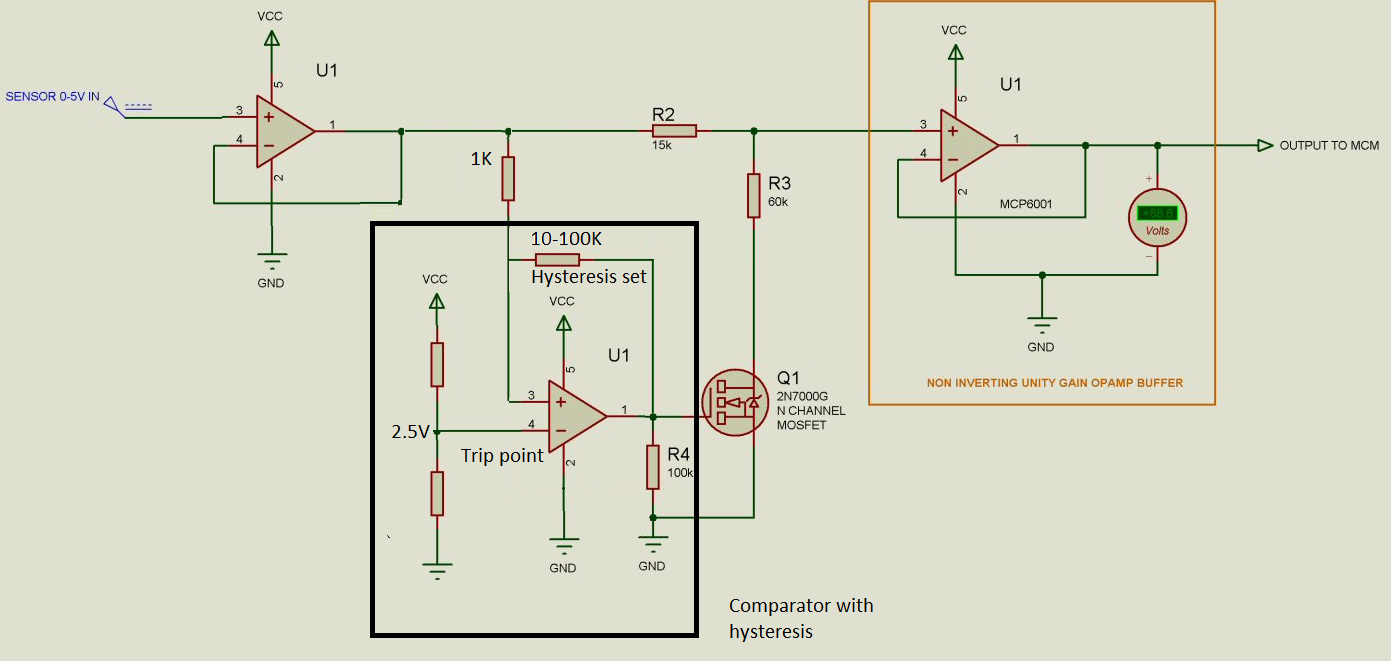 You got most of circuit. I added one more buffer, so input to rest of circuit is low impedance. If you know your sensor output, you can omit first buffer.