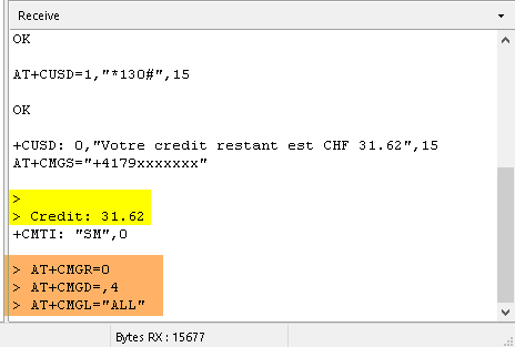 Appart from the next line +CMTI: "SM",0 indicating an incoming message, the next lines (braun highlight) are commands issued by my PIC but not recognized and therefore not executed. AAMOF, these three last lines are preceeded by a ">", the one that is probably waiting for AT+CMGS command termination.