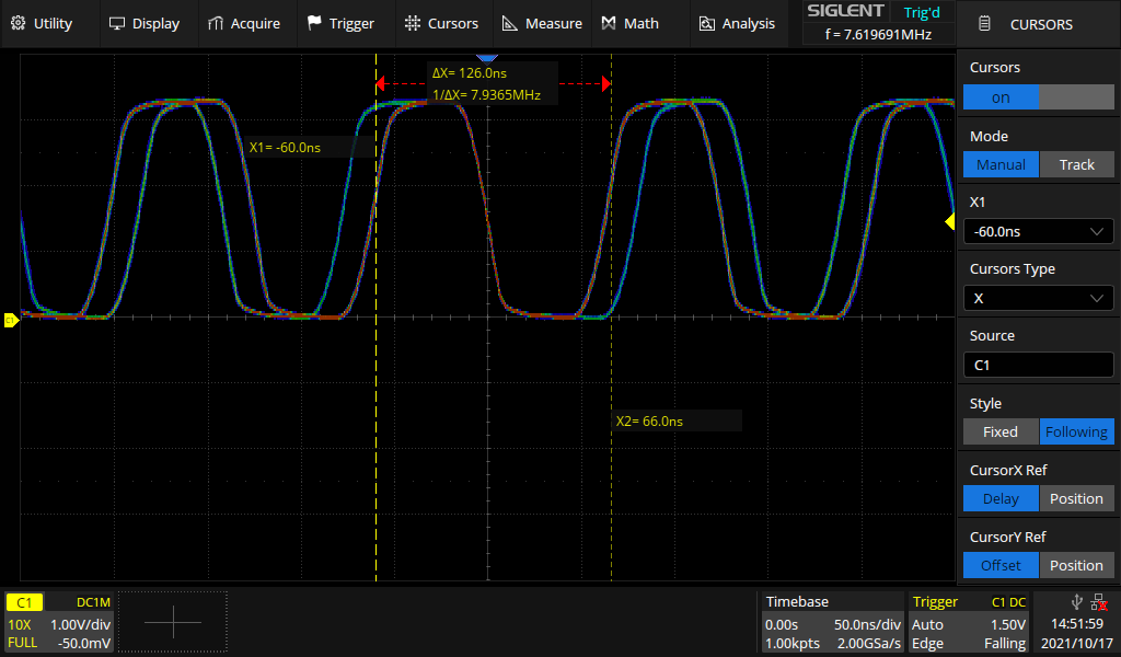 I tried to squeeze 11MHz out of it but it won't do it, runt pulses and all sorts of weird looking stuff - some of which most likely comes from the setup and probing.