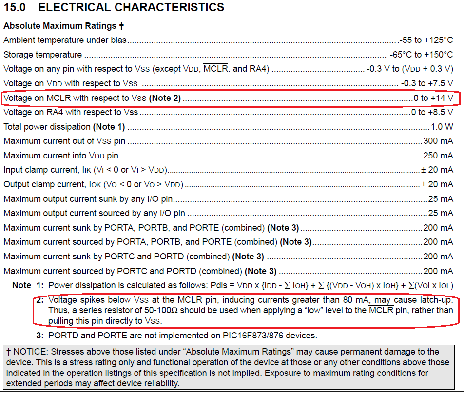 Note 2: ... a series resistor of 50-100Ω should be used when applying a “low” level to the MCLR/VPP/RE3 pin, rather than pulling this pin directly to VSS.