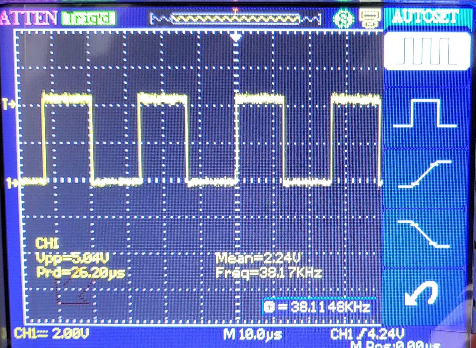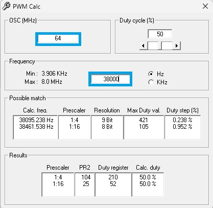 PR2 = 420 ' Set PWM Period for approximately 38KHz