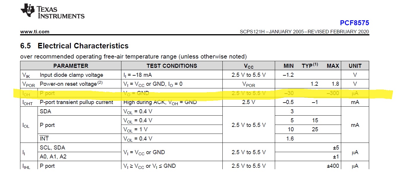 I measured short circuit current of PCF8575 outputs. It is roughly 0.16mA.