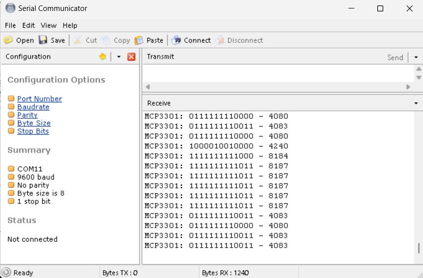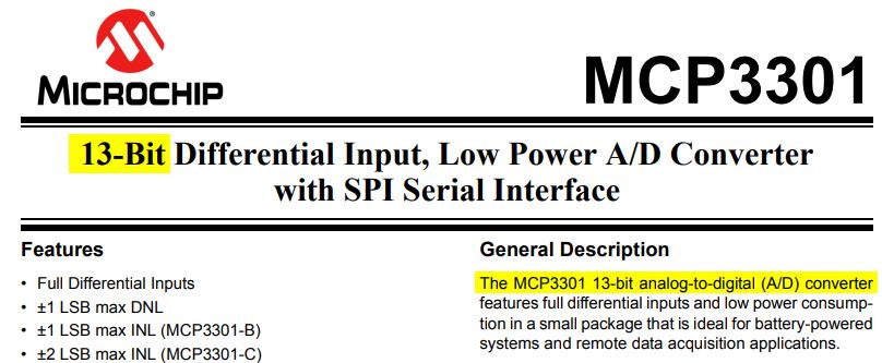 I'm trying to read a 13 bits MCP3301 A/D converter who's output value should go from 0 to 8191.