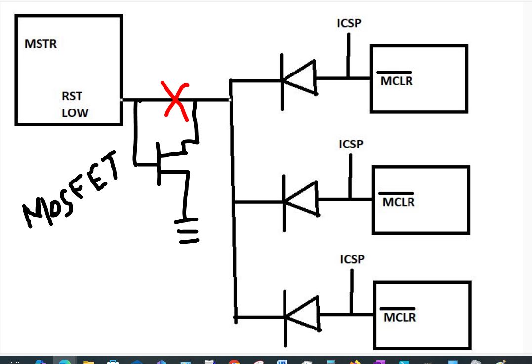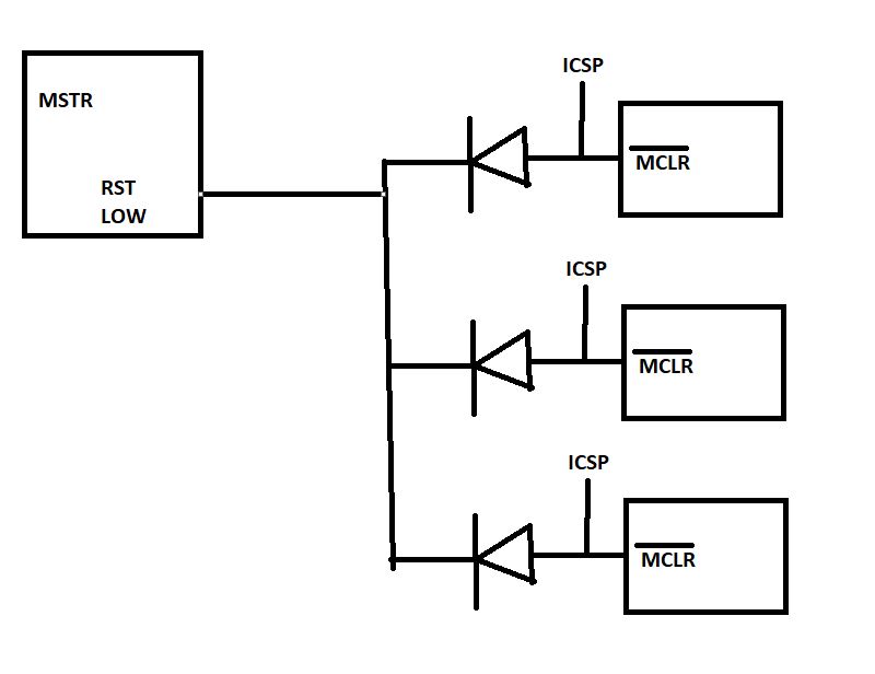 diodes can be like signal diodes 1N4148. Not backwards in order to pull MCLR low to reset and that is considering you do LOW VOLTAGE PROGRAMMING setting, if not doing that then would use the 2n3906 or any NPN to pull down all the slaves through the diodes. The @ RESET is an assembly instruction using the @ for PBP to do machine code directly ( I think you know all that stuff)...... so if you want a hard reset after ICSP then yes to use MCLR but if chips are running, you could give instruction to GOTO reset.