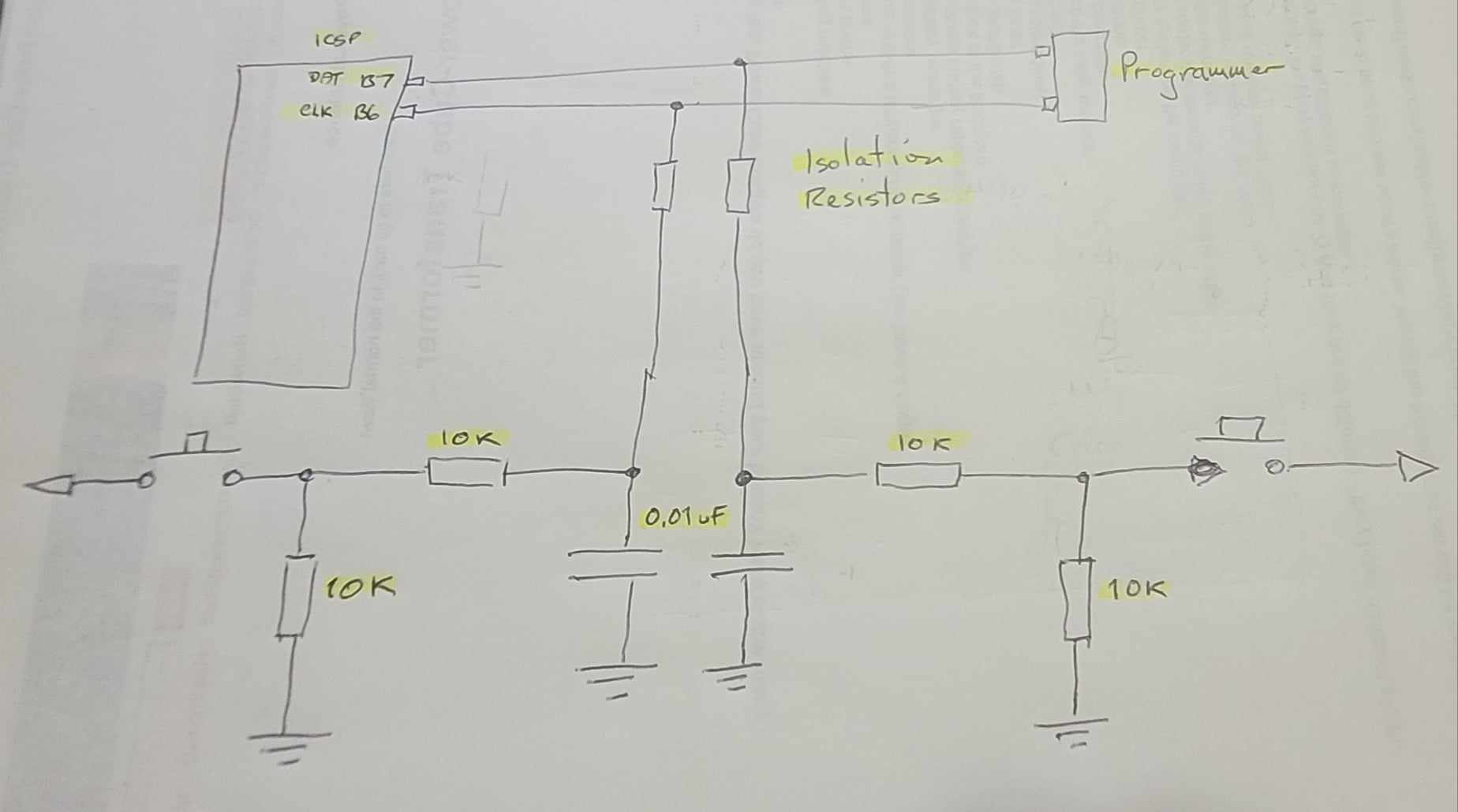 My practice is what Richard noted. Always have either external pull ups or use the port b with the internal pu enabled and active low switch. No other circuit needed and have the Icsp programmer there just fine.