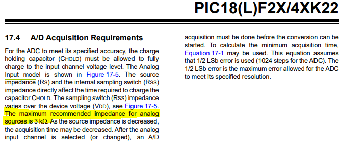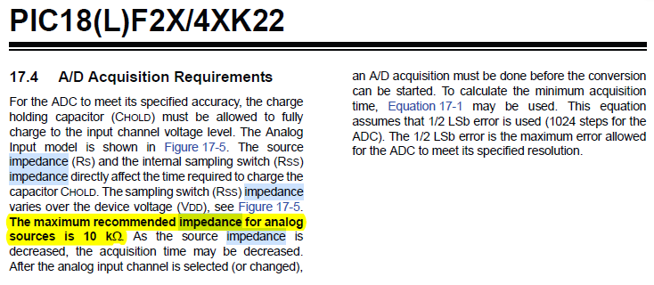 ... Look at section 17.4 (or table 27.21) of the datasheet for the 26K22. It states that the maximum recommended impedance is 3k. ...