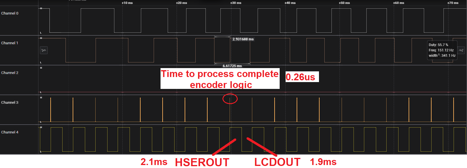 I'm more than satisfied with what I have so far as encoder logic. When I remove LCDOUT, this is how many times the encoder logic can cycle during a fast pulse; a gazillion.