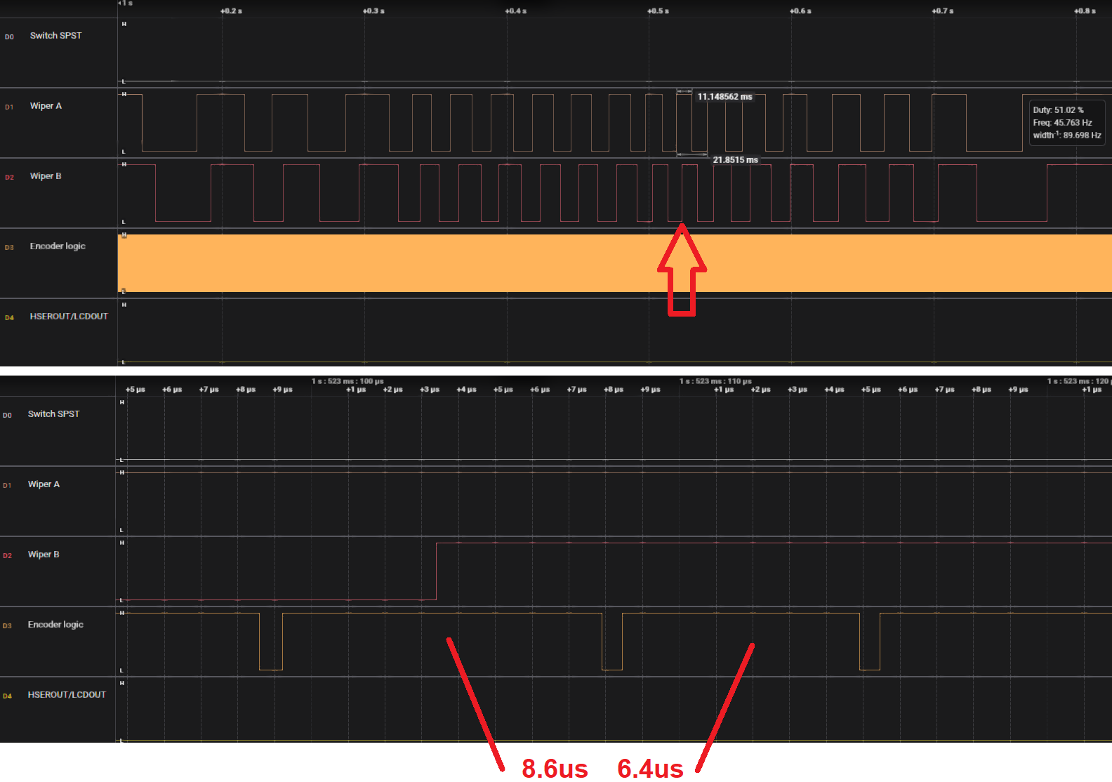 The pulsewidth of channel A is 11ms but the time between the edges on A and B is much shorter than 5.5ms due to the fact that the phase shift is far from 90° on your encoder. Lets say it's 2ms... How long does your LCDoutput subroutine take?