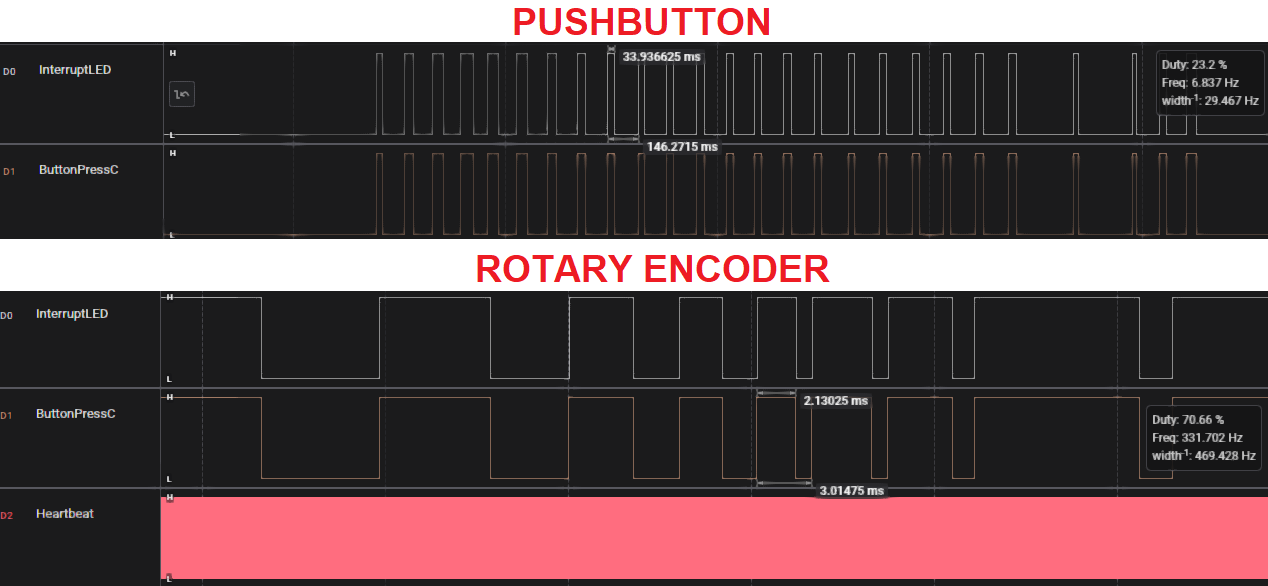 Using the IOC logic above, along with Bourns debounce circuit (10K/0.01uF) followed by a 74HC14, these are the signal speeds I was able to get using an ordinary pushbutton and EC11-type rotary encoder: