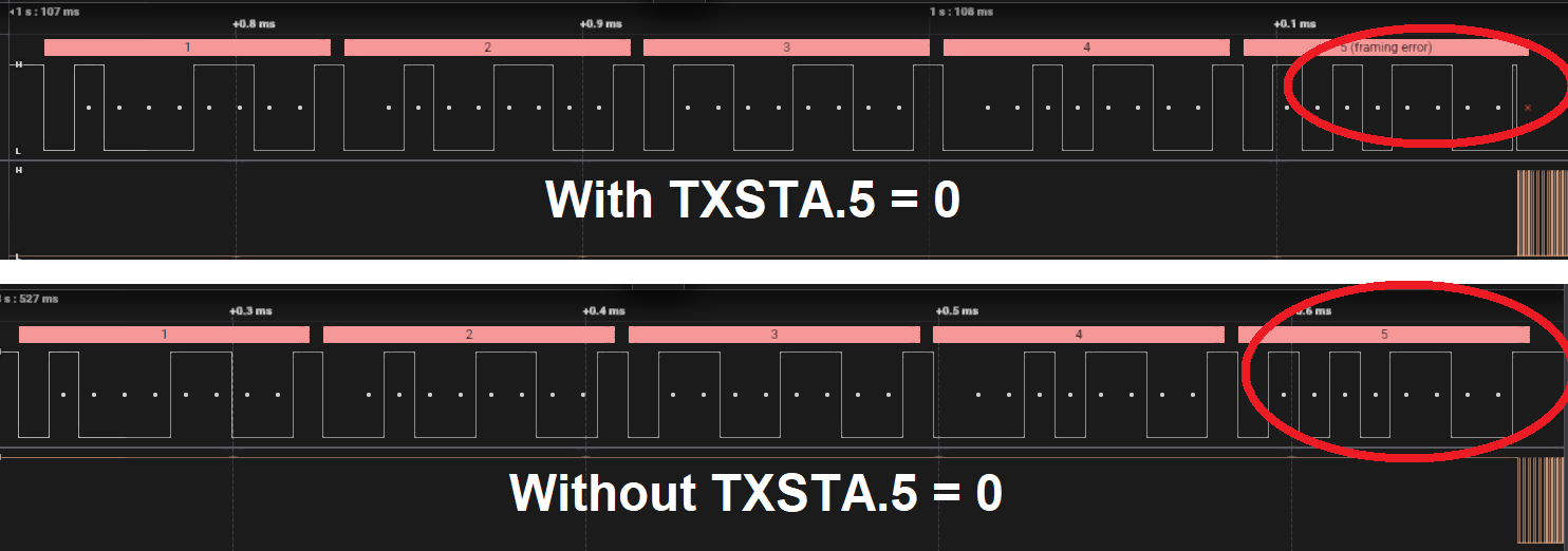 TXSTA.5 = 0 ' <----- Causes Framing error after last byte !