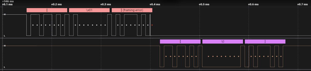 ...when tx module is disabled the pin reverts to be an output driven low , hence framing error