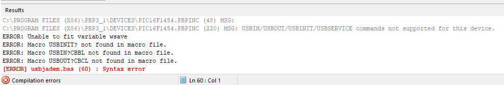 Has anybody tried to make a USB project with a PIC16F chip? I'm trying to make the PIC16F1454 work with USB, but I'm getting this error from PBP3 "USBIN/USBOUT/USBINIT/USBSERVICE commands not supported for this device." This chip has USB capabilities. This error makes me think that PBP3 doesn't support USB in PIC16F chips. Any advice or comments are greatly appreciated.