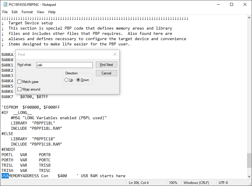 If I search USB in PIC18F4550.PBPINC, I get this: