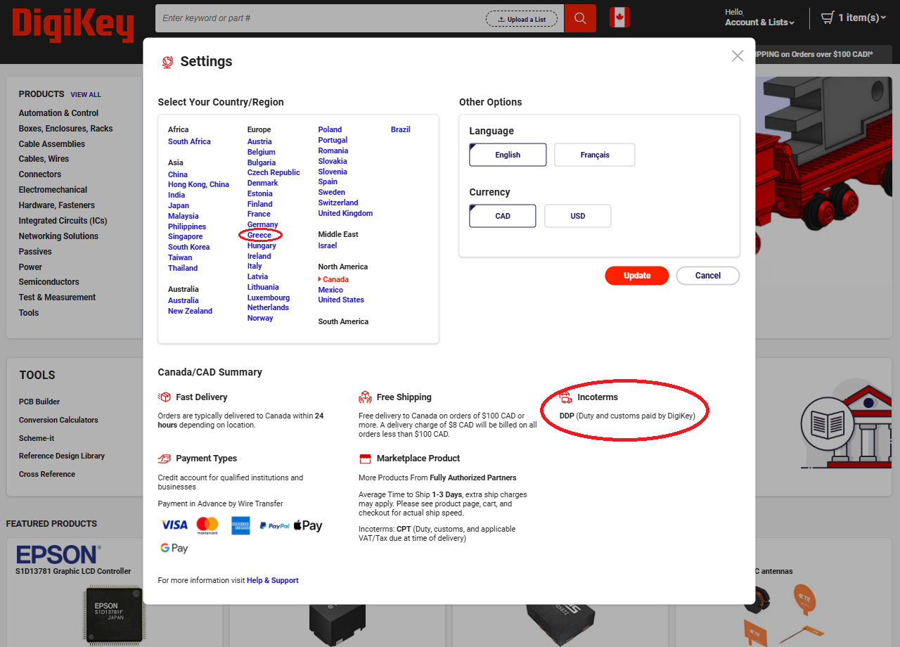 Digikey offers a deal on "Incoterms" when I select Canada with CAD currency.