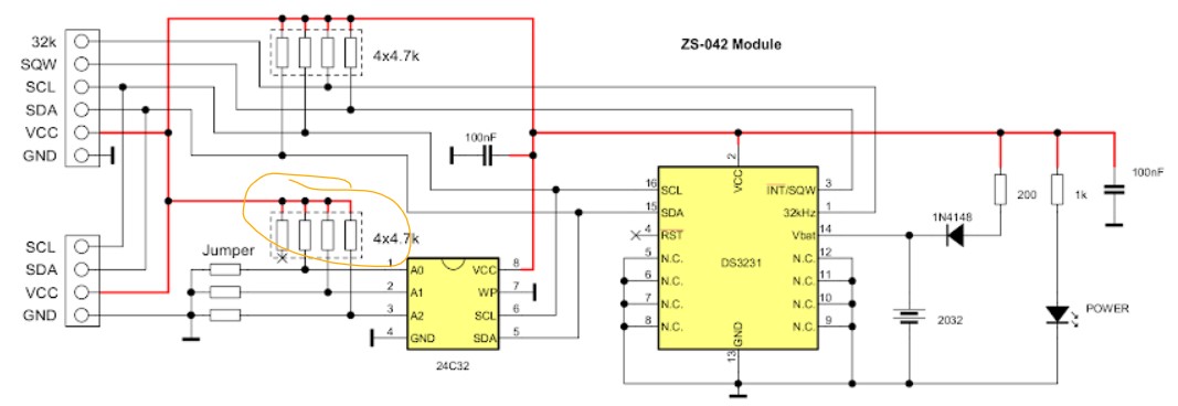 to my surprise i found the 24c32 on my ds3231 module did not behave as expected when the resistor block [circled] was removed