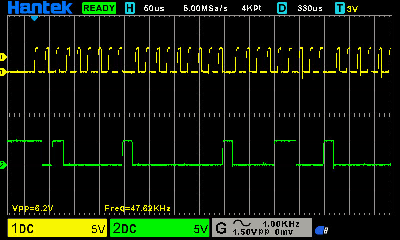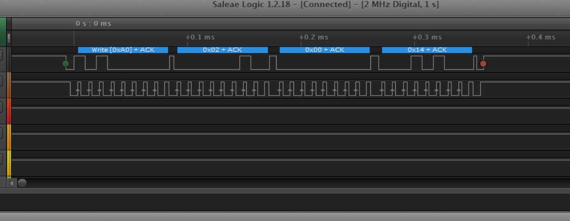 In the traces below, it can be seen that start sequence at the beginning of the 4th byte is correct with the data going low followed by the clock going low, but it was not preceded by stop sequence. The data is released high followed by the clock released high rather than the reverse order.