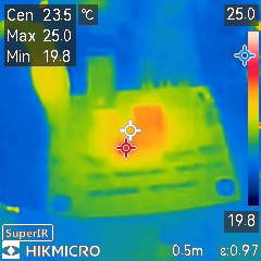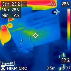 Bottom side, center is at 23C, the max spots are my finger (can see through top left mounting hole too) and LED strip in background.