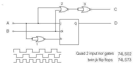two other parts of the quad nor gate (2 and 3 above) to produce a hardware XOR on output C and producing the waveform at bottom of screen.