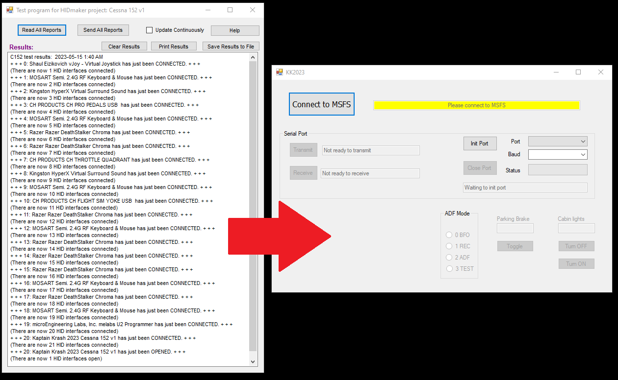 - generate USB C++ code, I chose C++ MFC cause I recently saw that in the MSFS SDK docs, compile in x86 ok.