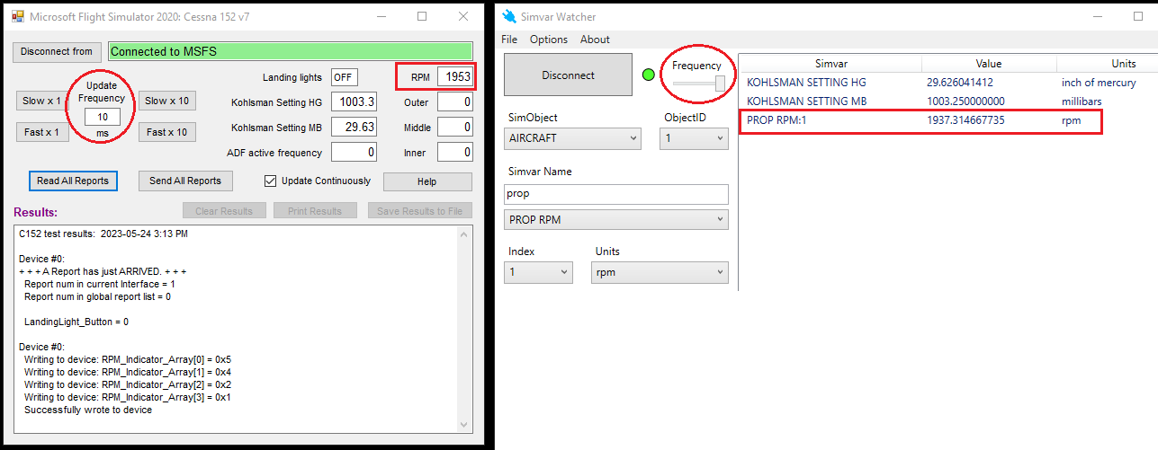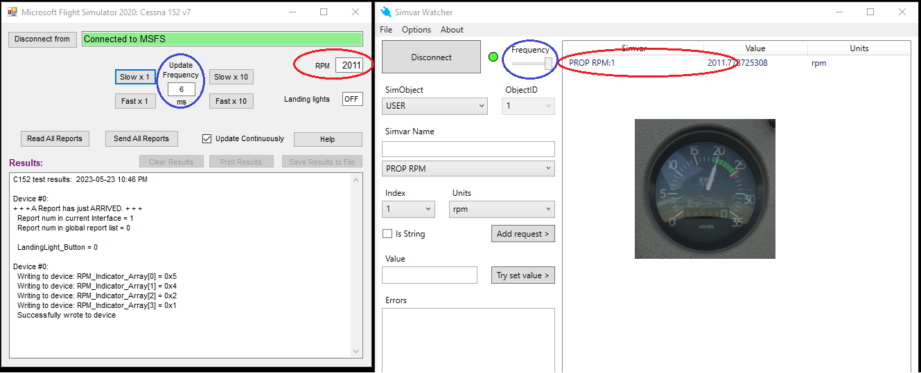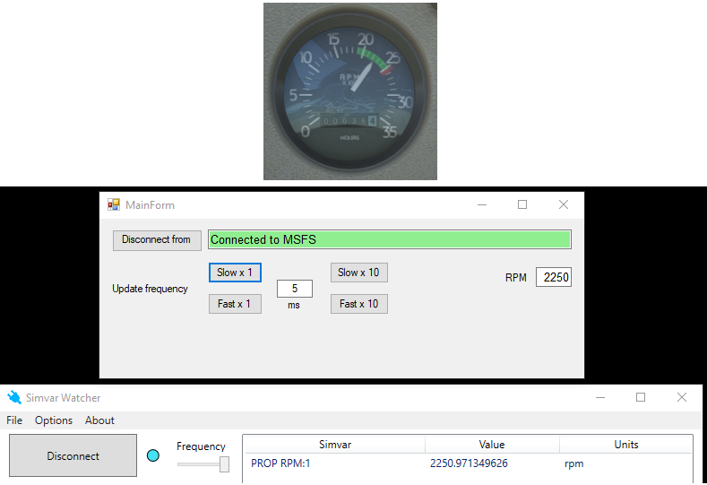 I had a serious lag issue with my USB generated code when I'd read variables from the MSFS SDK. So I started a new program from scratch, no USB, made just to read the Engine RPM and nothing else. Then I compared it with SimVar Watcher; it's the tool distributed along with the SDK to doublecheck our work. Turns out I had to add a delay feature to run beside SVW at full speed (I got extra practice on string manipulations and tweaking a Timer on the fly, so not a waste of time).