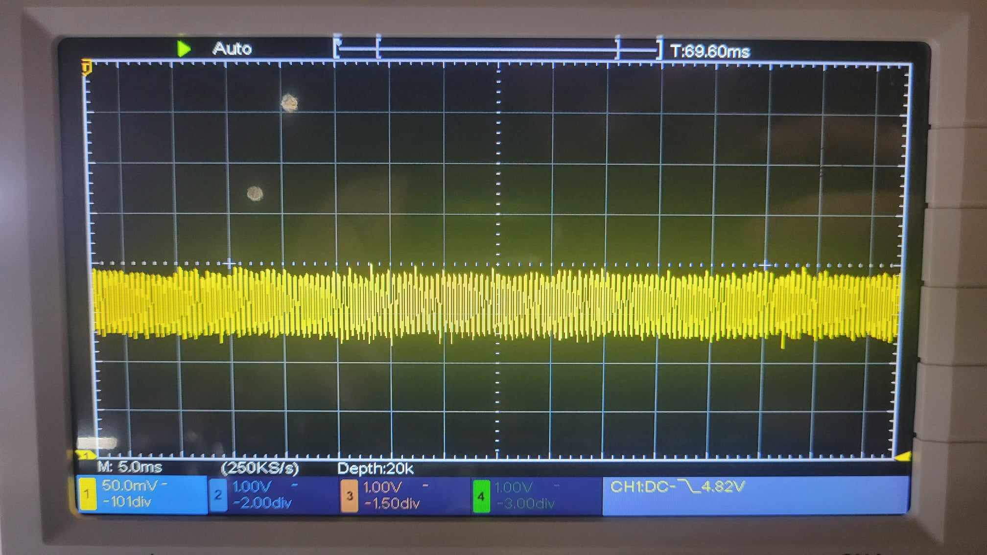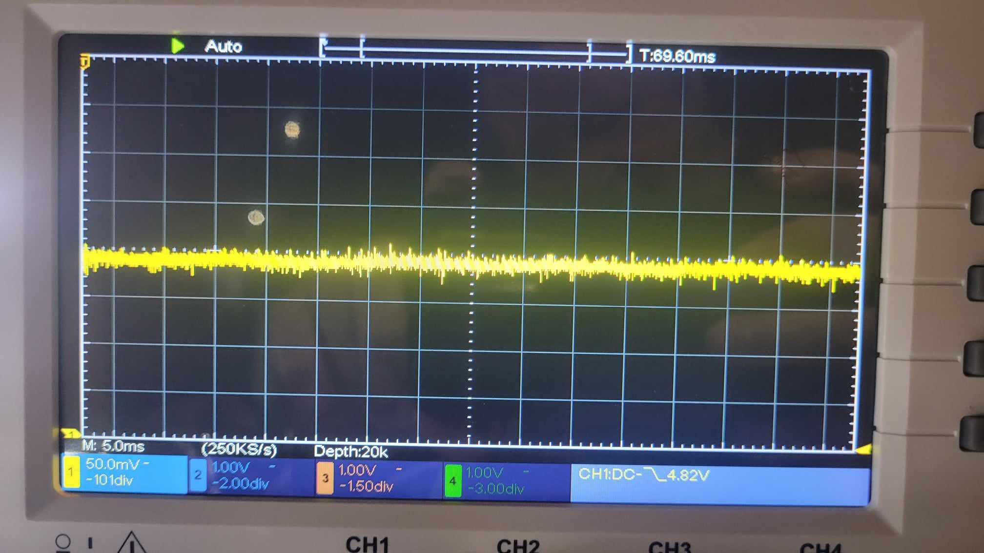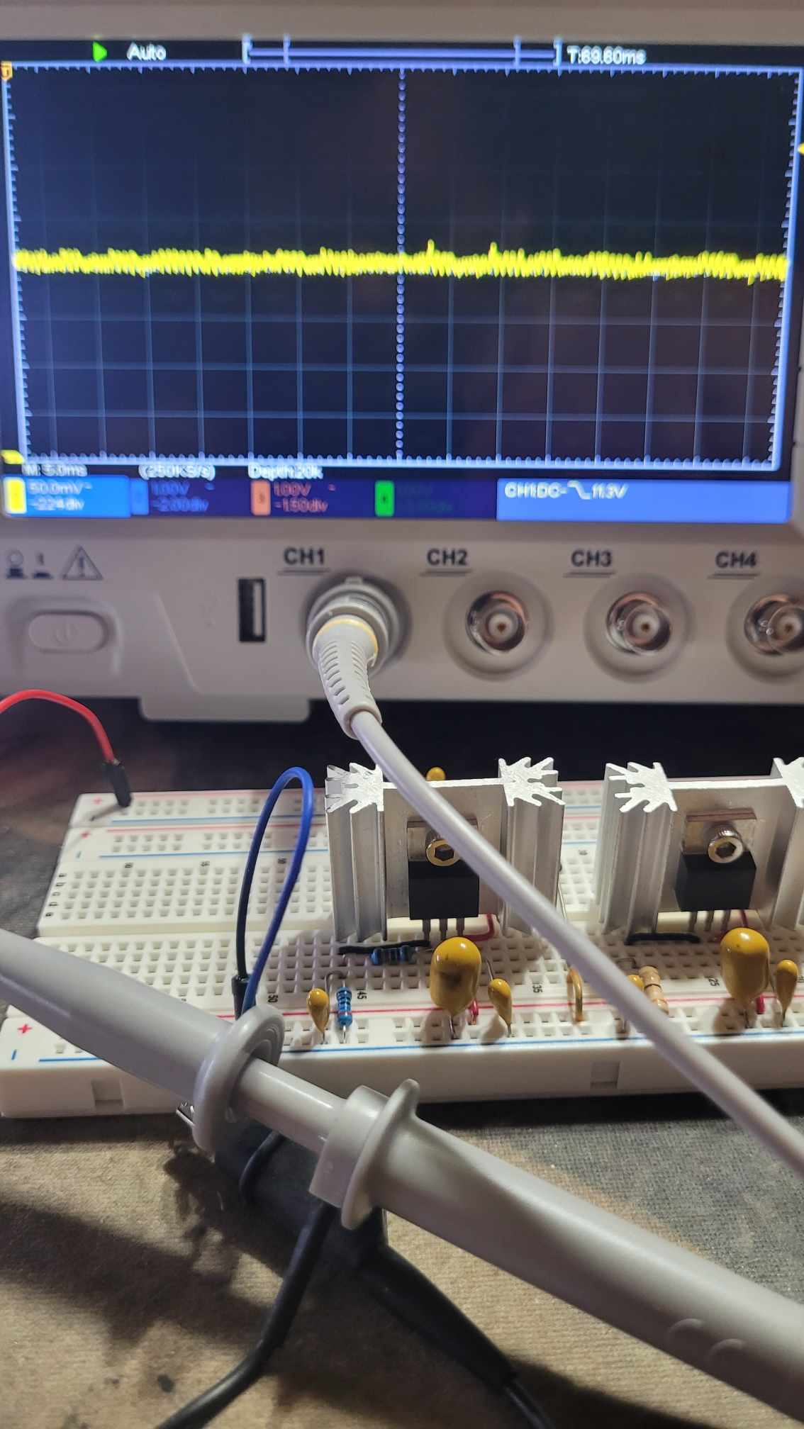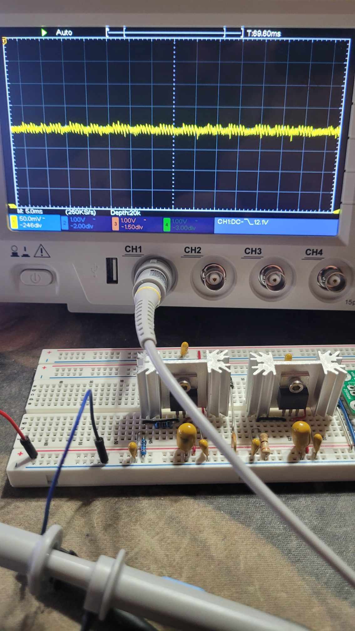 This is the LM1084-ADJ running at 5.2V (PIC, LCDs and other ICs), note that is had less ripples as stated in the specs: