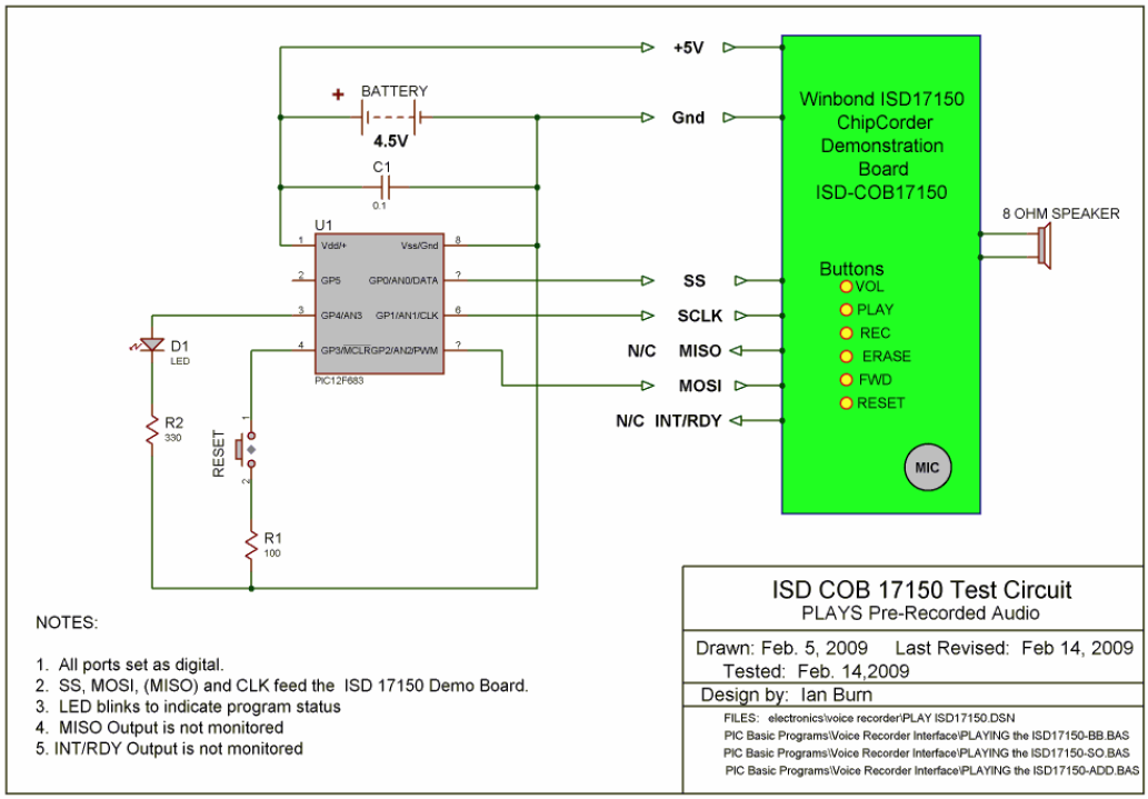 If you are building your own, you can use any schematic for an ISD1700 series chip, change it to your liking, and control it with a PIC device. Here is a schematic for one that is controlled with a PIC12F683, and the example PicBasic Pro code. This example uses a similar demo board to the one I referred to earlier. So between the two, you have a full schematic of the interface, and all the supporting electronics. Since you are building it, edit it as you please, and build it like you want.