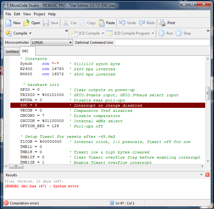 This is a simple example showing how to work with el-cheapo type RF modules using PBP SEROUT2/SERIN2, and showing how to break-out of a SERIN2 line, with interrupts, for a remote control decoder that operates in momentary mode.