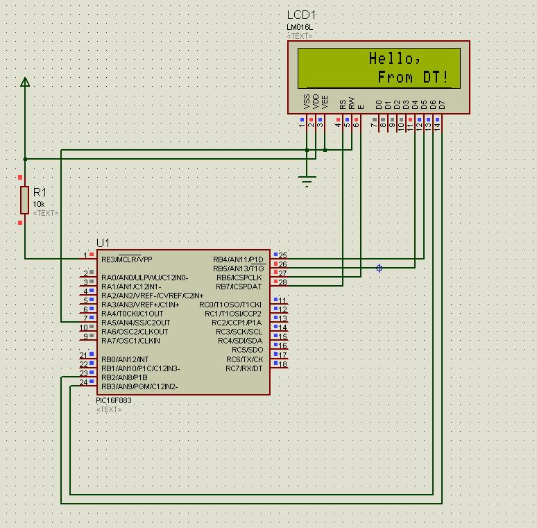 I'm trying to get my LCD (H44780 type) to be hooked up to the 16F883 as follows: